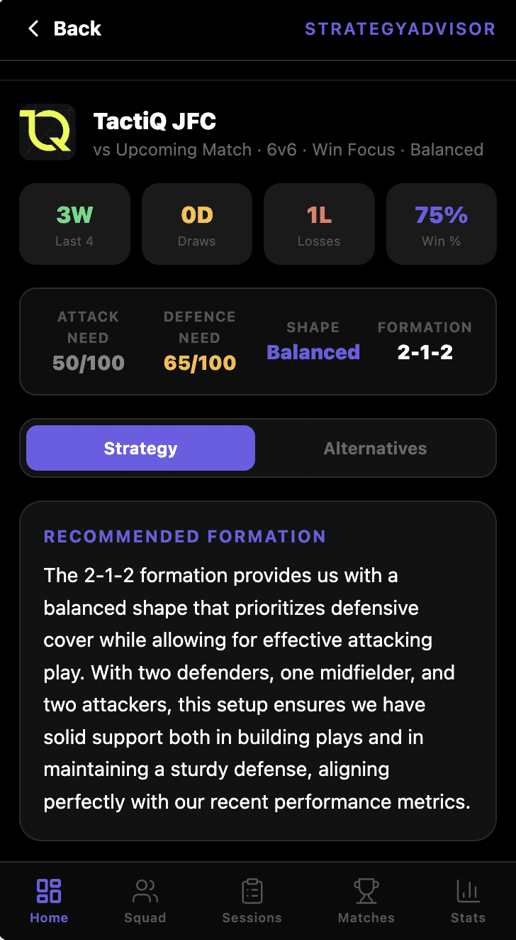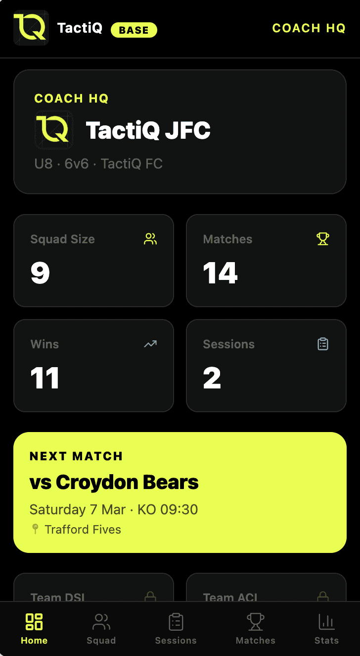 Coach HQ is the home screen that gives you an instant snapshot of your team and your season, showing your squad size, matches played, wins and training sessions in clean summary cards.